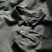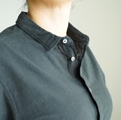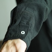 シャツは現代の民族服を構成する洋服としての提案になります。構成は洋服のルールに則りながら、極力デザインを削ぎ落とし、機能性に基づいたパターンメイクとしています。具体的には袖山をいせ込み、袖底を高めに設定することで腕周りの運動量を、背中のヨークにタックやギャザーではなく、いせを入れることで背中の運動量を確保しています。また通常シャツで使う接着芯の代わりにふらしで表地を使い、縫製糸は全て綿糸を使う事で柔らかな仕上がりとなっている為に、素肌でも快適に着用が可能です。前立てには手織りの質感が伝わるように生地の耳を使用し、ボタンには淡水貝を用いてます。(SH-03とは異なる貝を使用しています。)