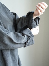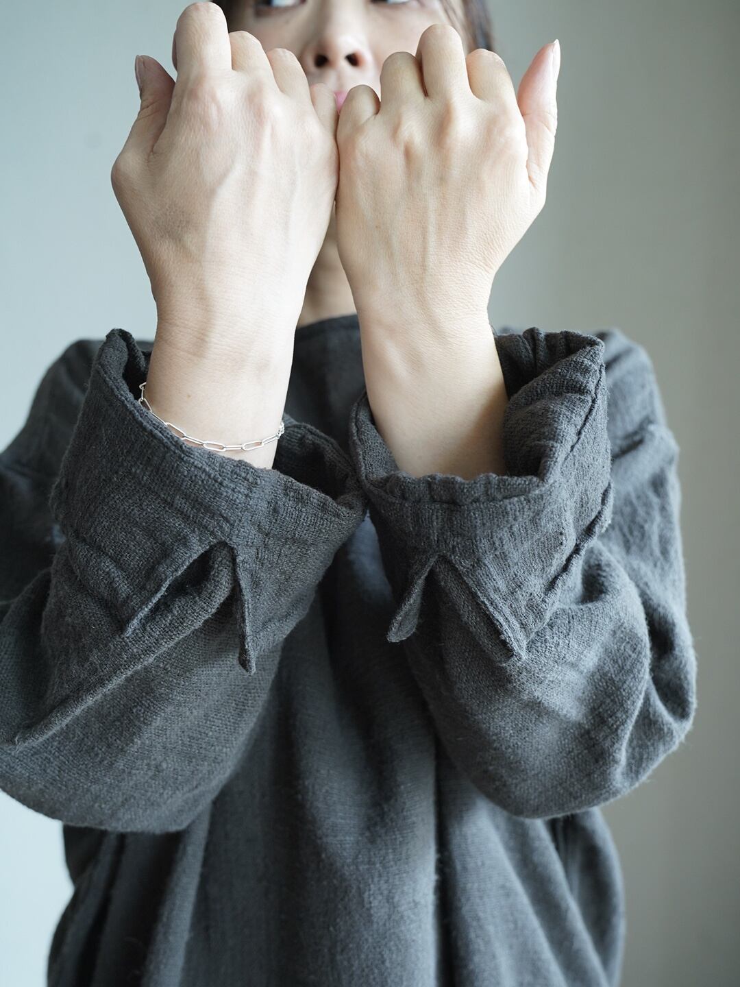 kalaコットンの原綿は品種改良のされていない原種のヘルバケウム種で、農薬を必要とせず、水も少量で済むため非常に環境負荷が低いのが特徴です。SNとはシングルニードルの略で、ガンジーが発案した家庭用のポータブル紡ぎ機の呼称になります。現在シングルニードルよりも生産性の高い、アンバーチャルカが主流な中、現地の村の女性たちの手によって少しずつ糸が紡がれ、手織りで織られています。時折ランダムに生じるボーダーは手仕事の細かな糸のロットの変化によって生まれ、それも特徴の一つとなっています。 肌なじみの良い生地をそのまま使用し、プルオーバーとしてTシャツのように気軽に着用していただけるデザインです。ワイドシルエットのため身体と空間が空くことで、生地感と相成って多くの方に快適に感じていただけます。袖口はカフス仕様になっており、そのまま折り返して着用することができます。また、カフスのスリット部分には放射状に補強STがあり、耐久性にも配慮されています。※手織りの布を使用している為、サイズ感や風合いに個体差があります。織りくせ、糸の節、生じる毛玉などは表情の一部とお考えください。機械織りの生地より強度が低い為、過度の負担は避けてください。随時ケアのご相談も承っております。
